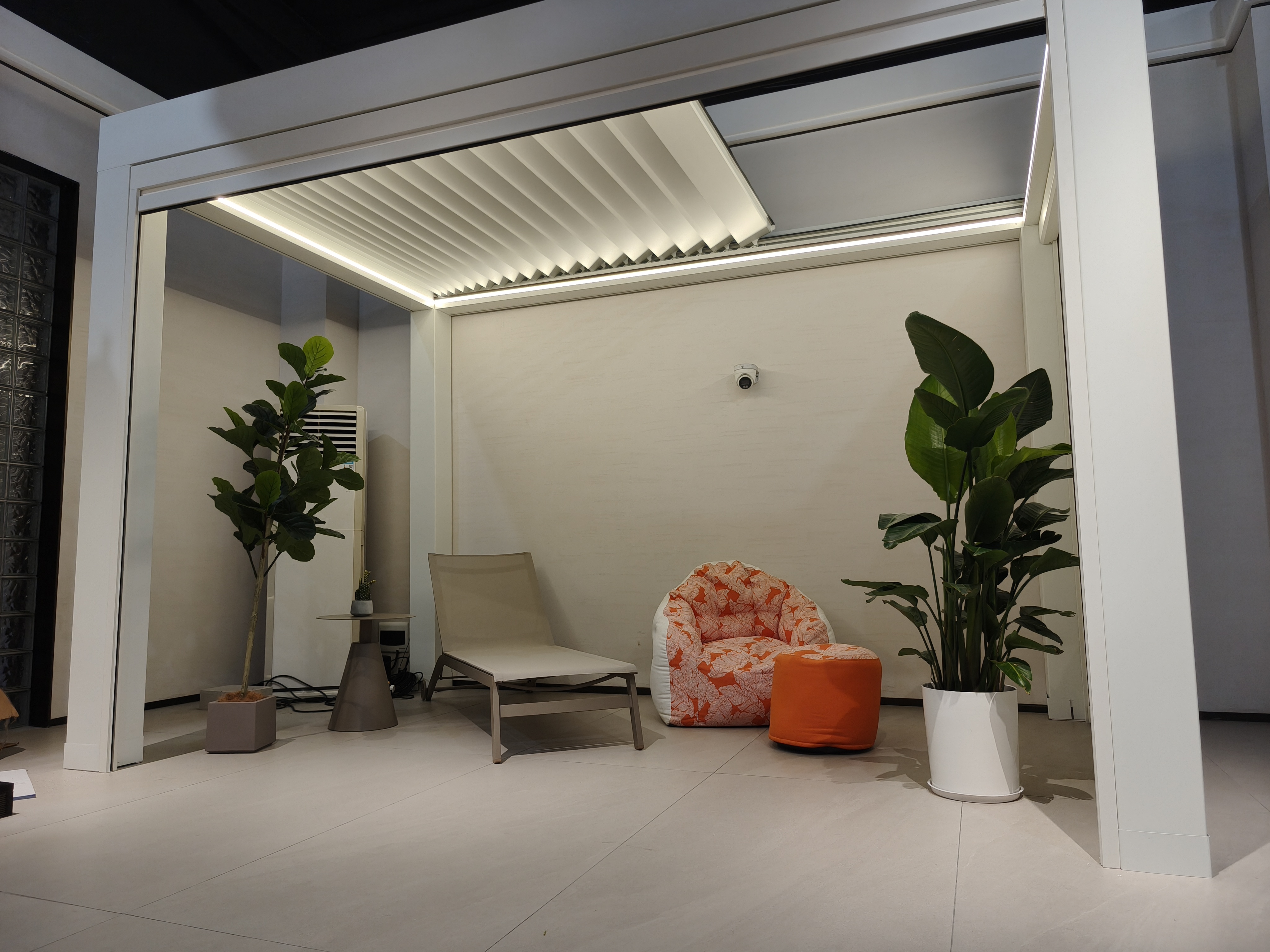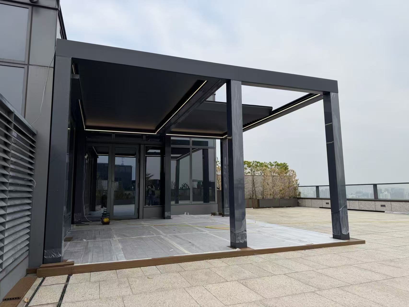 Die bioklimatische Pergola bietet Schutz vor Wetter und verbindet Funktionalität mit moderner Ästhetik.