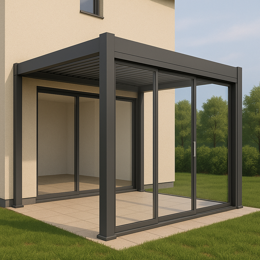 Verwandeln Sie Ihre Pergola in einen geschützten, lichtdurchfluteten Raum – mit unserem rahmengeführten Glasschiebetür-System.