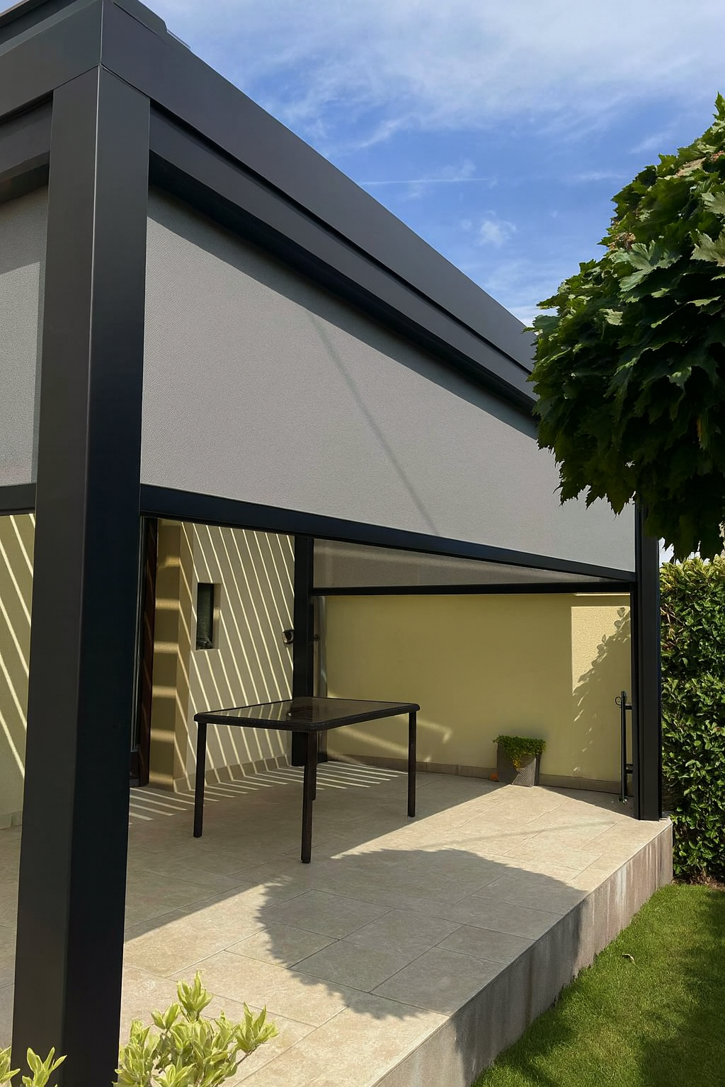 Rüsten Sie Ihre Pergola mit dem motorisierten Zip-Screen auf, um Ihren Außenwohnraum funktionaler und angenehmer zu gestalten.