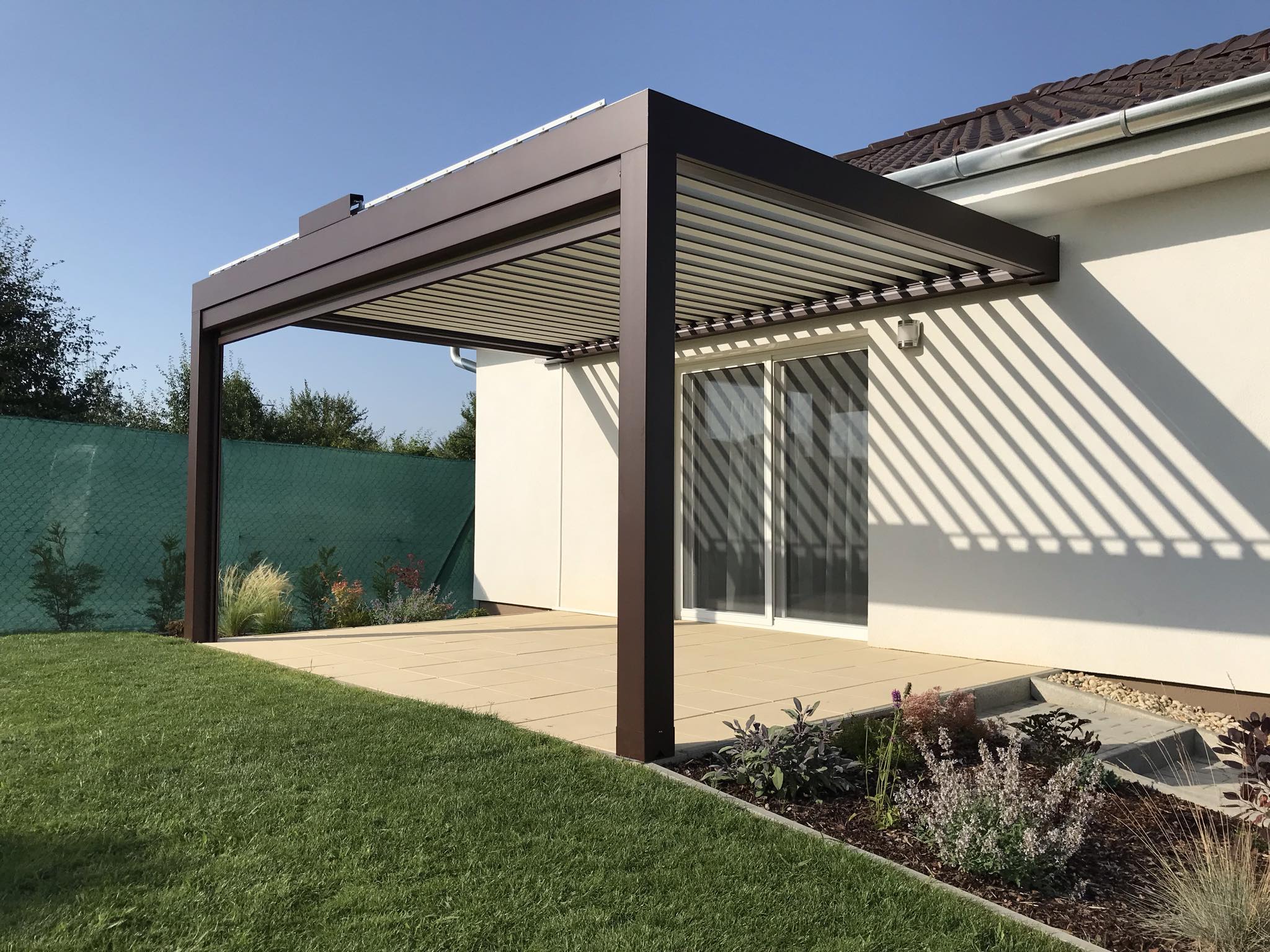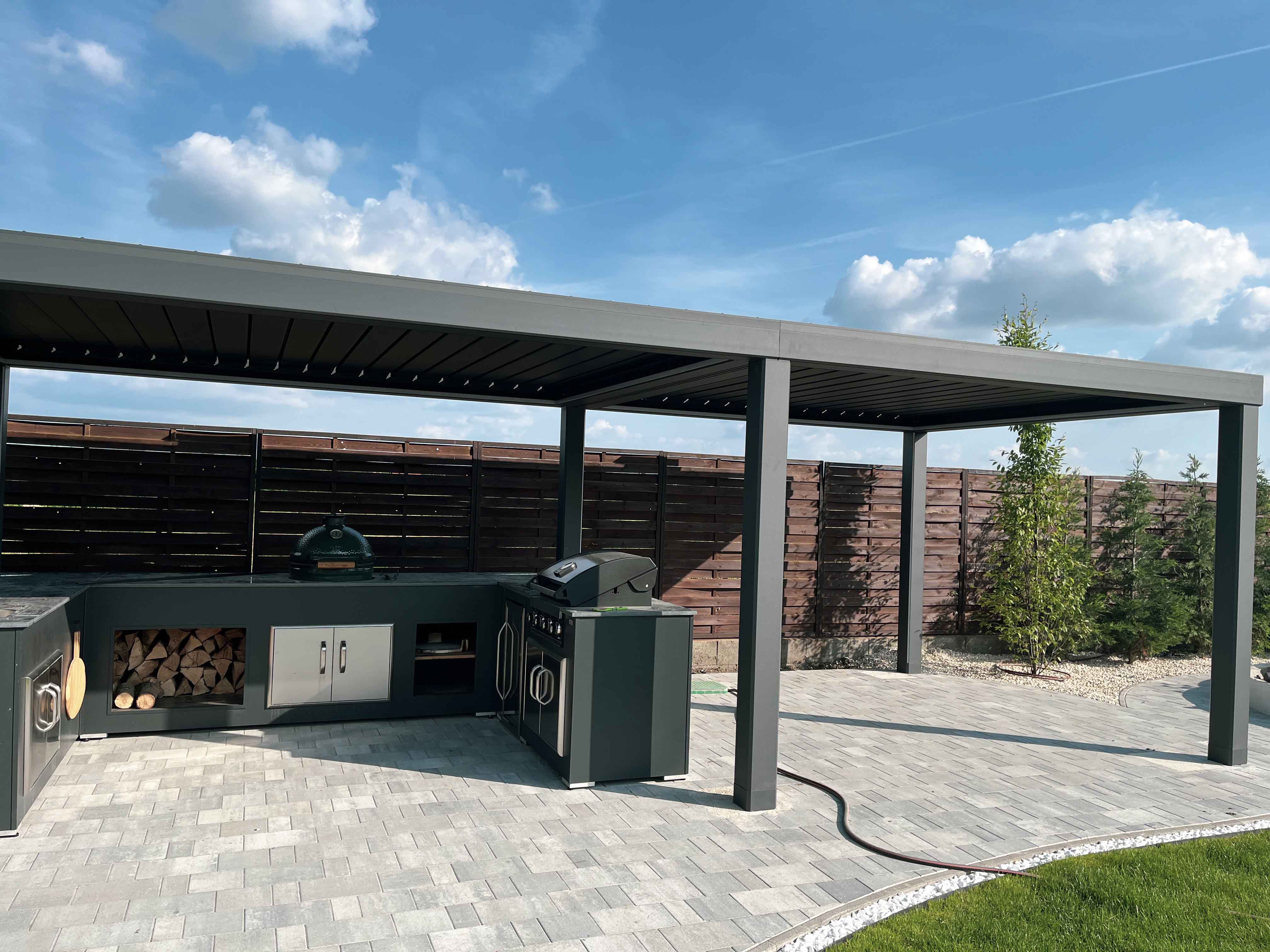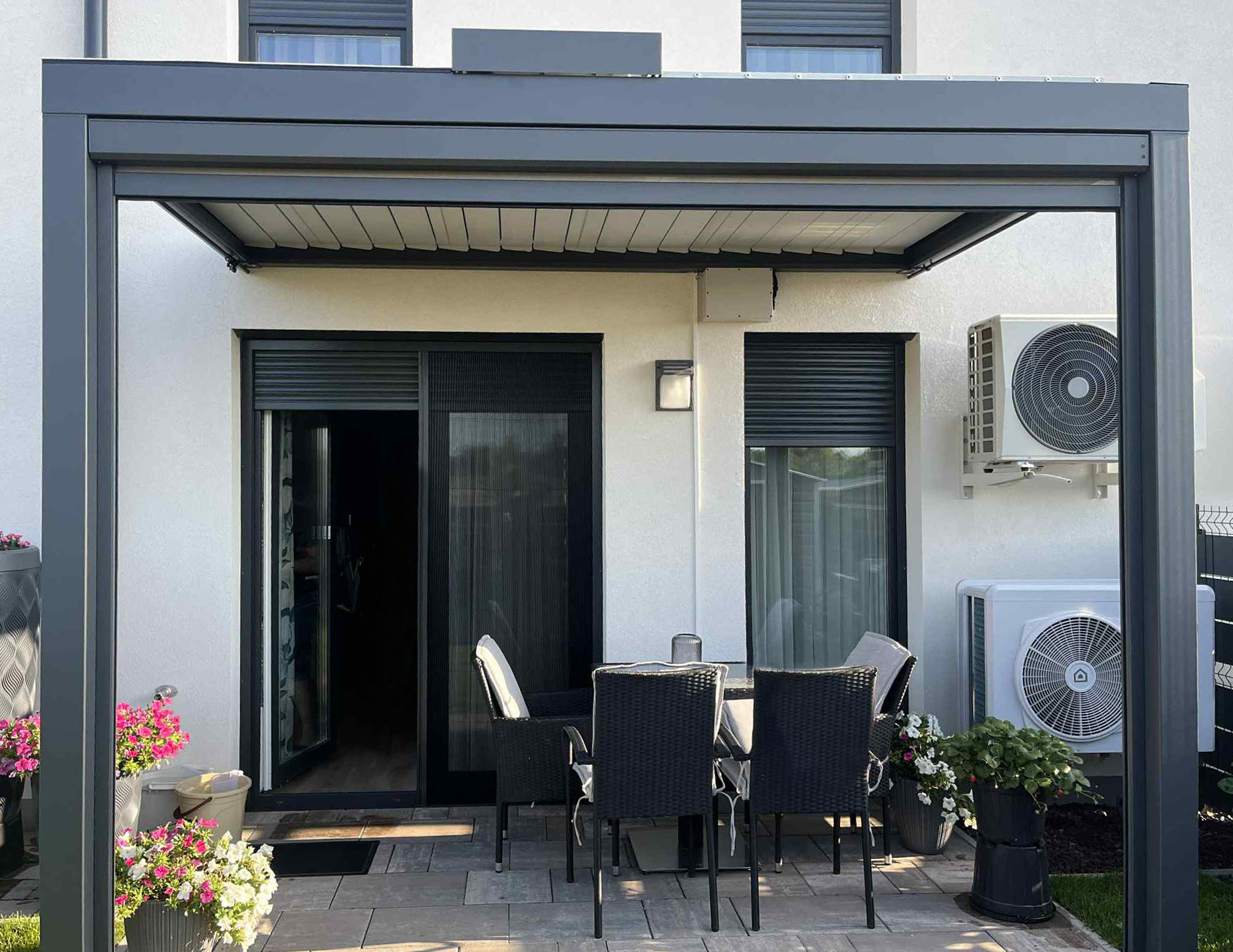 Die bioklimatische Pergola bietet Schutz vor Wetter und verbindet Funktionalität mit moderner Ästhetik.