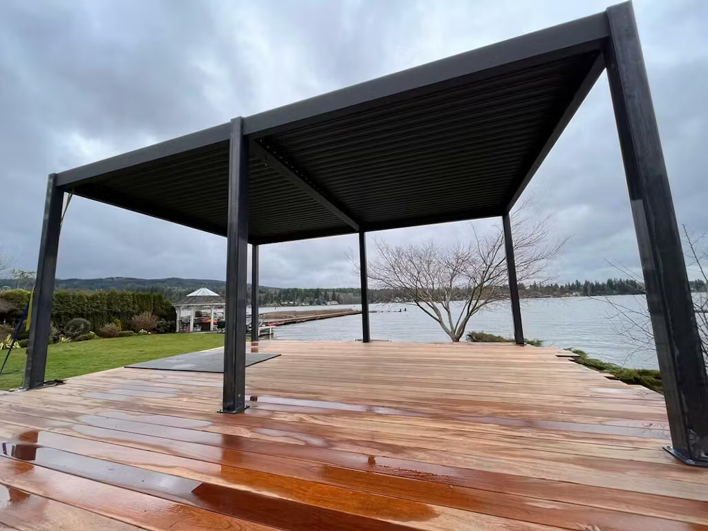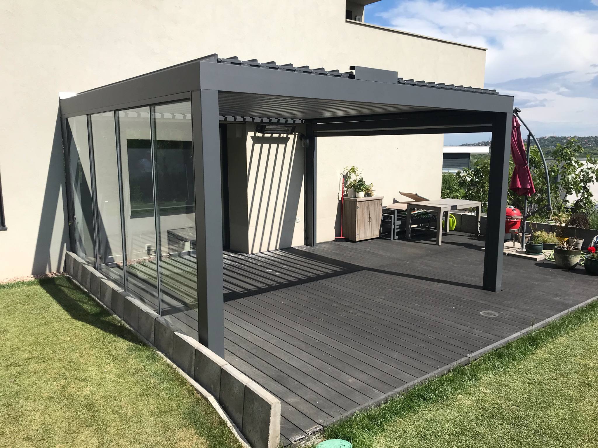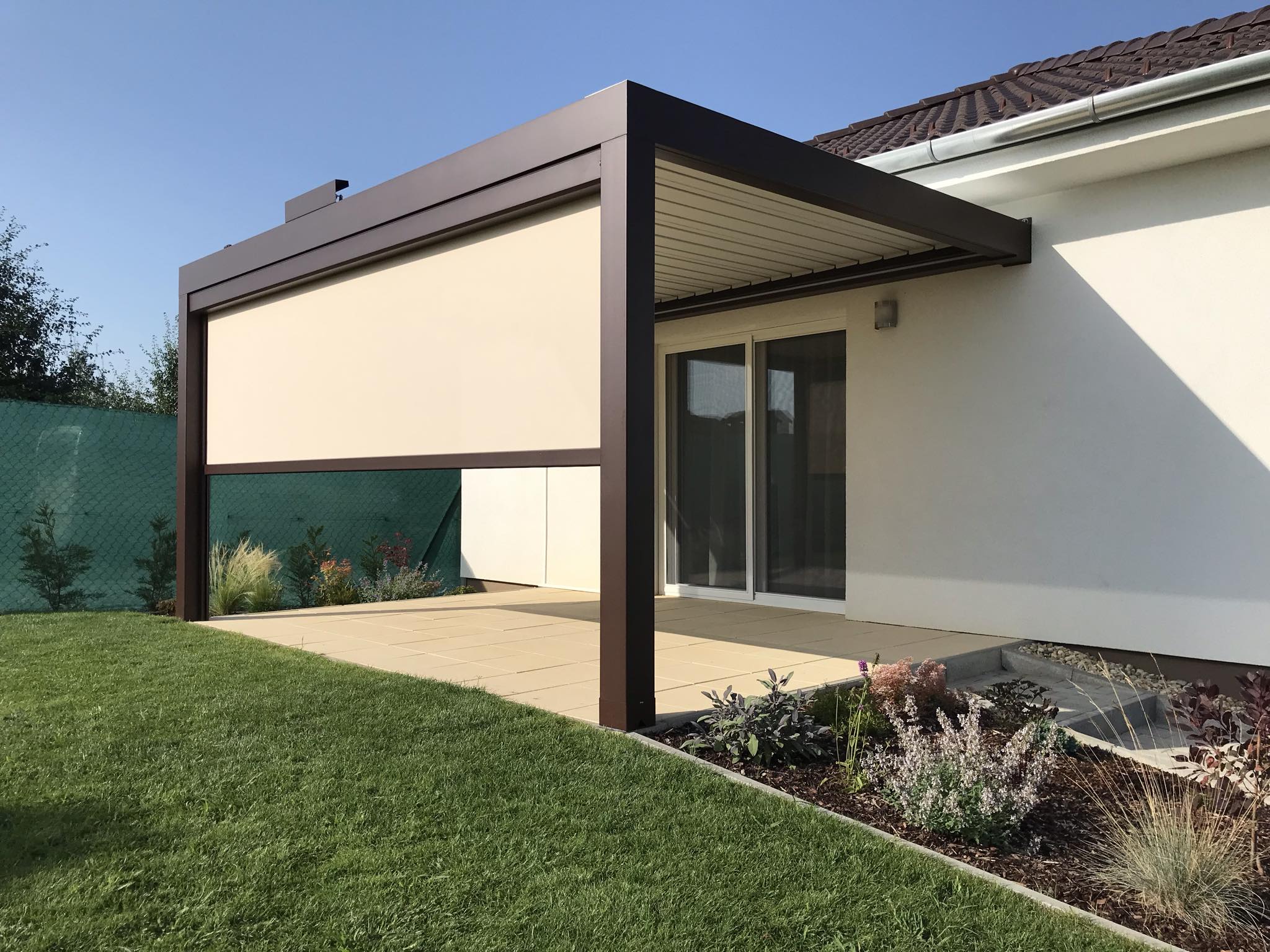 Die bioklimatische Pergola bietet Schutz vor Wetter und verbindet Funktionalität mit moderner Ästhetik.