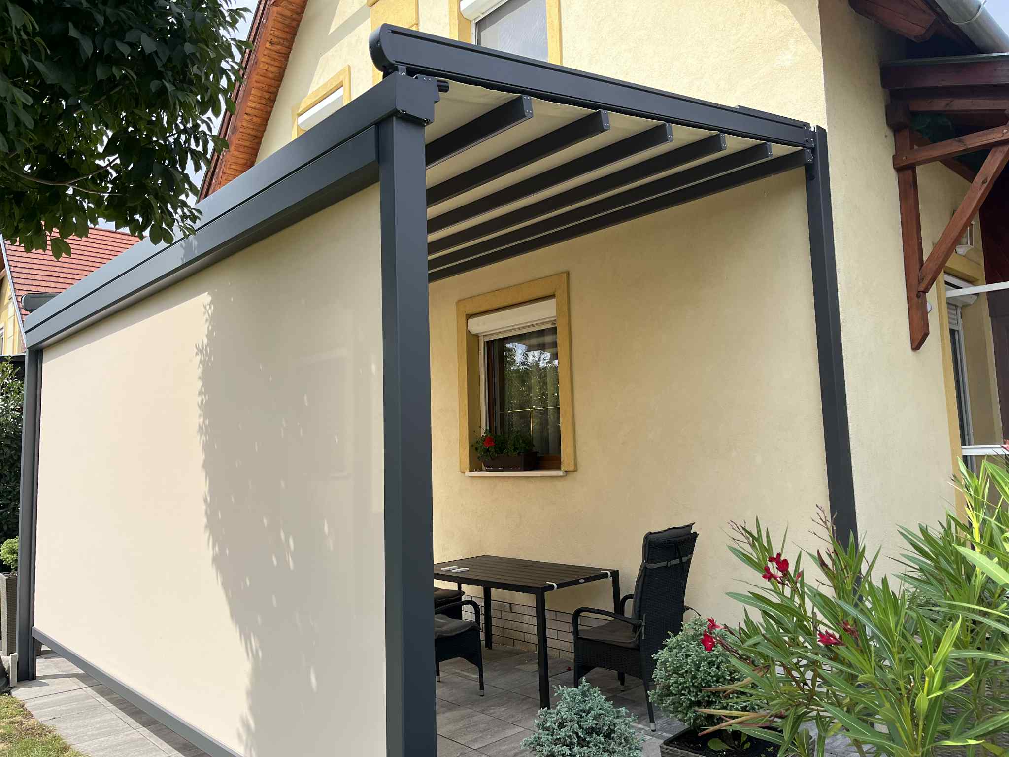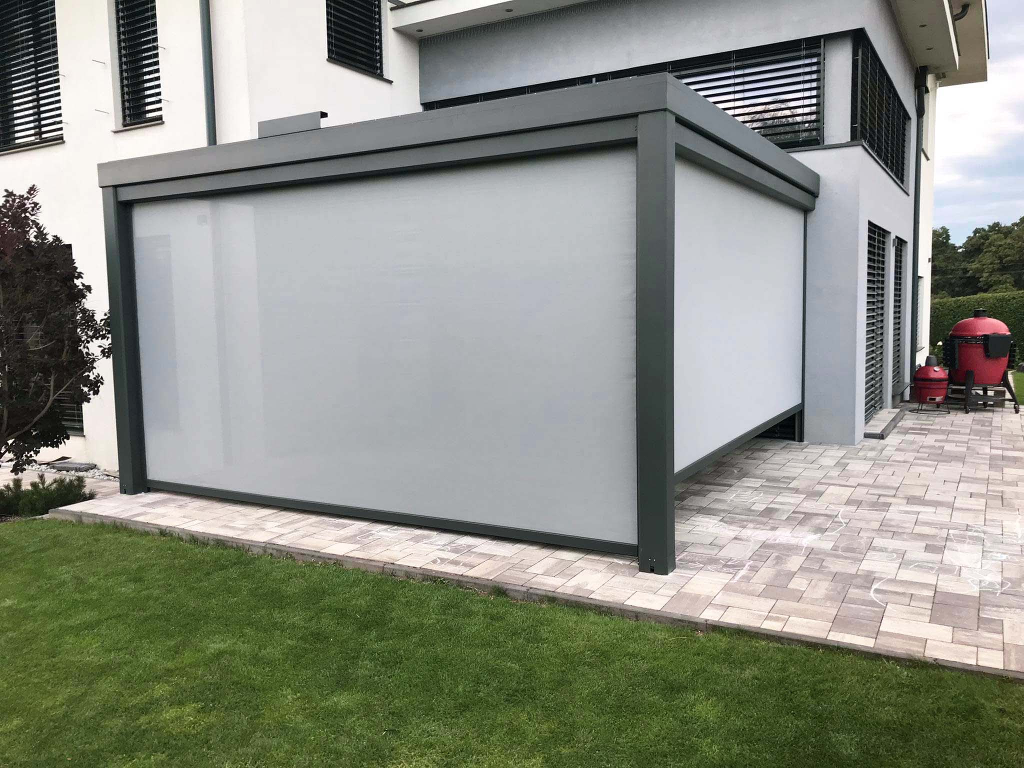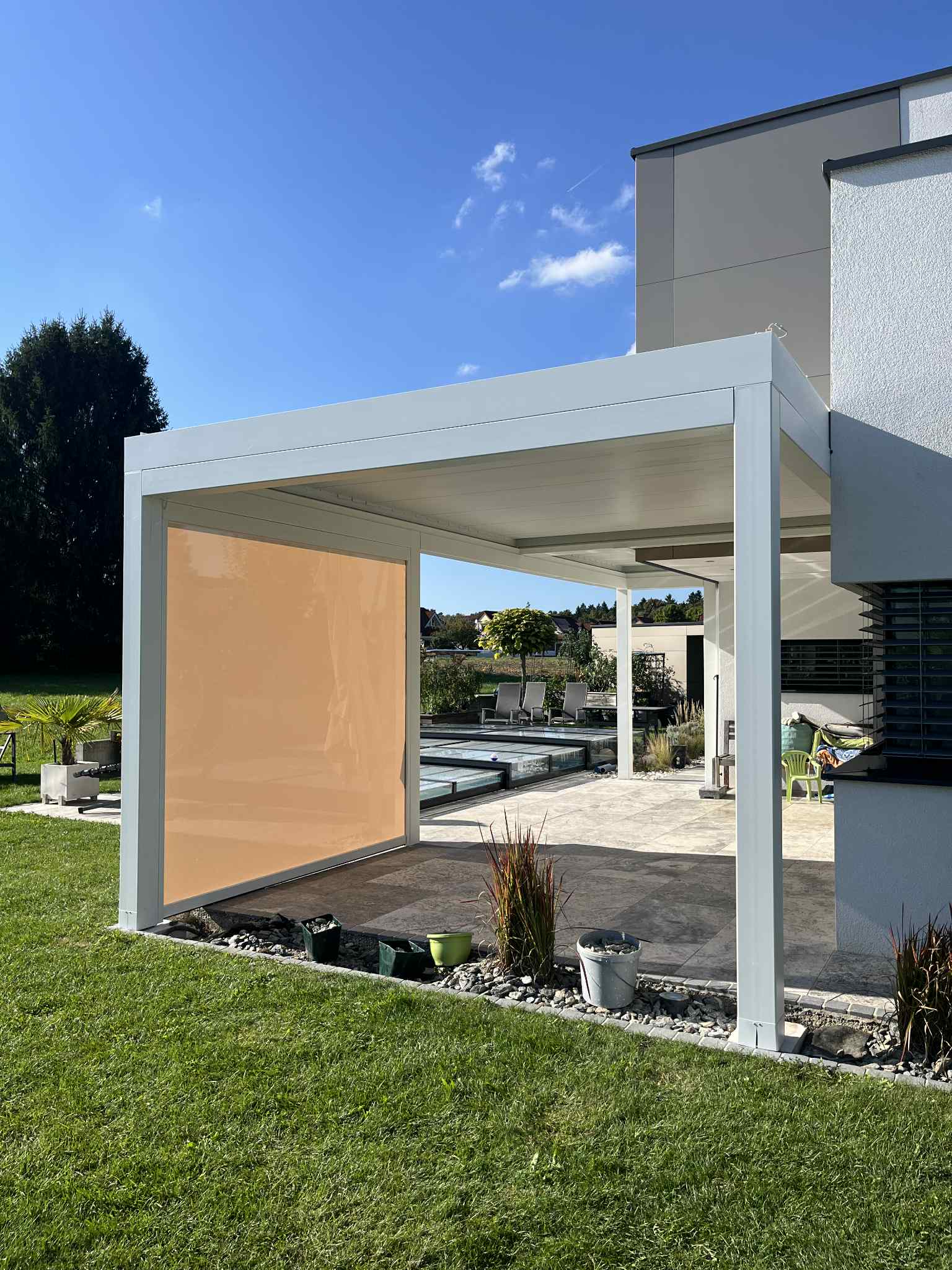 Unsere Pergola mit PVC-Plane kombiniert robusten Wetterschutz mit klarer, moderner Linienführung.